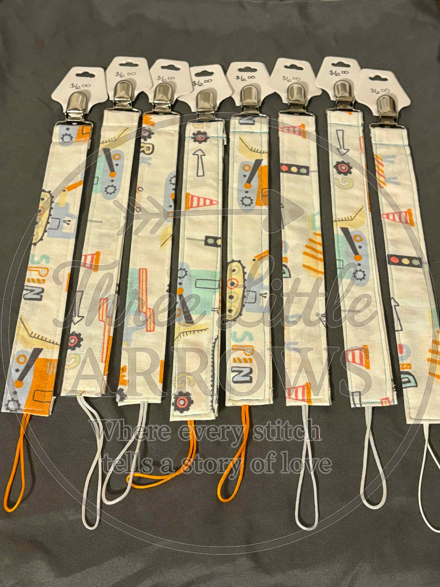 Keep your baby’s pacifier secure and stylish with this Construction Zone Pacifier Clip. Featuring a fun pattern of trucks, cones, arrows, and gears, this clip is perfect for little ones who love big machines and adventure!