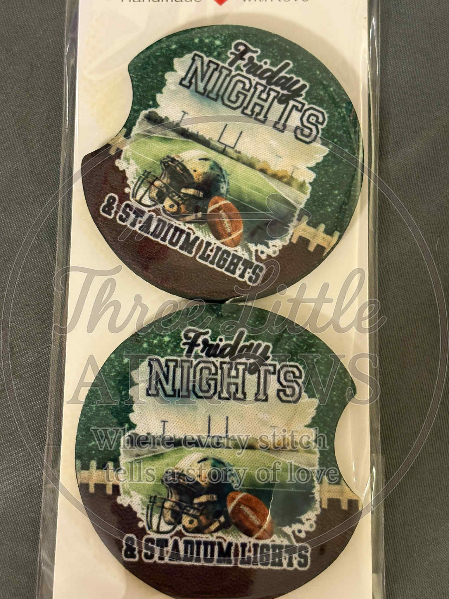 Celebrate the excitement of Friday nights under the stadium lights with these Football Car Coasters! Featuring a bold football field and helmet design with the phrase “Friday Nights & Stadium Lights”, this set is perfect for fans who live for game day energy. Add a sporty touch to your ride while keeping it neat, clean, and ready for kickoff.