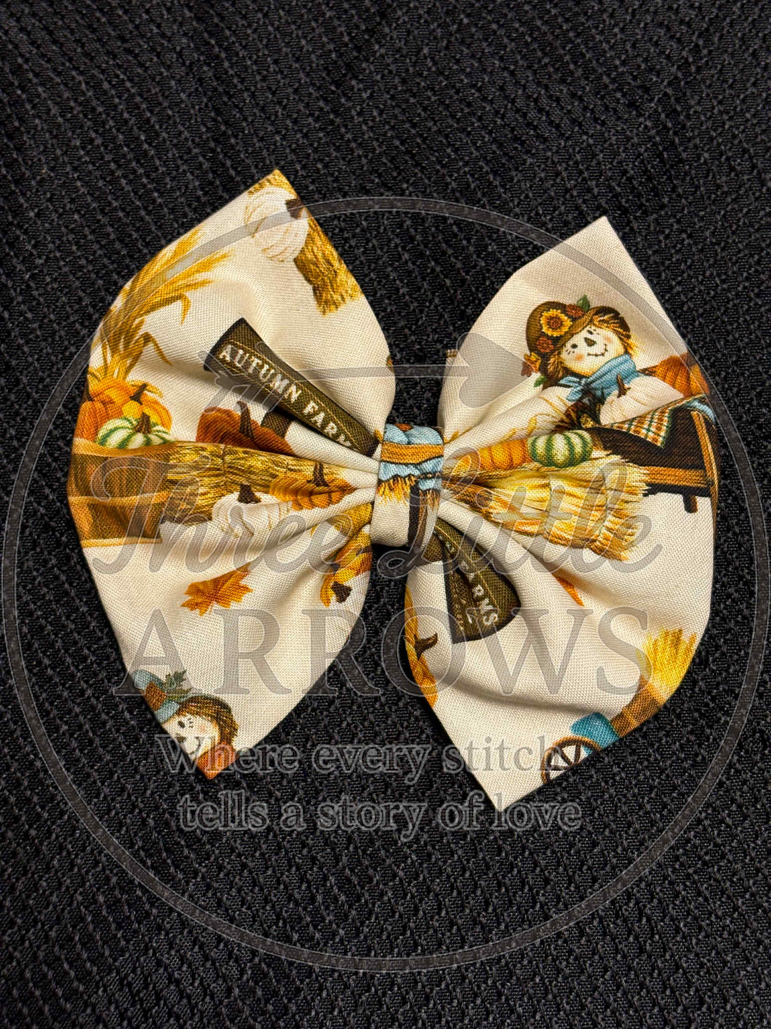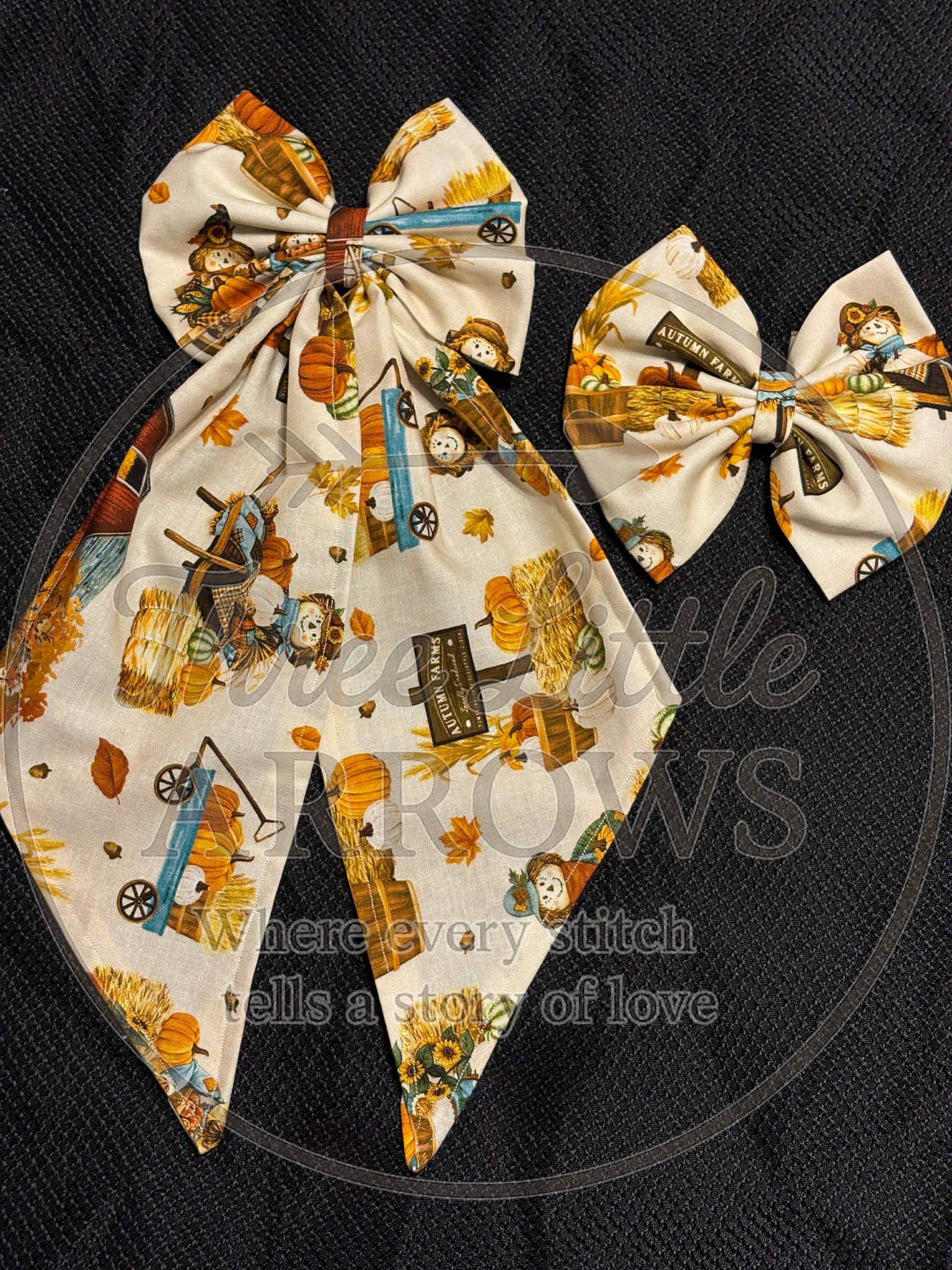 Celebrate the charm of fall with our Scarecrow & Harvest Bow Set! Featuring playful scarecrow designs, pumpkins, sunflowers, and cozy autumn accents, these bows are the perfect seasonal accessory for your little one. The set includes one large statement bow with flowing tails and one smaller coordinating bow for versatile styling.