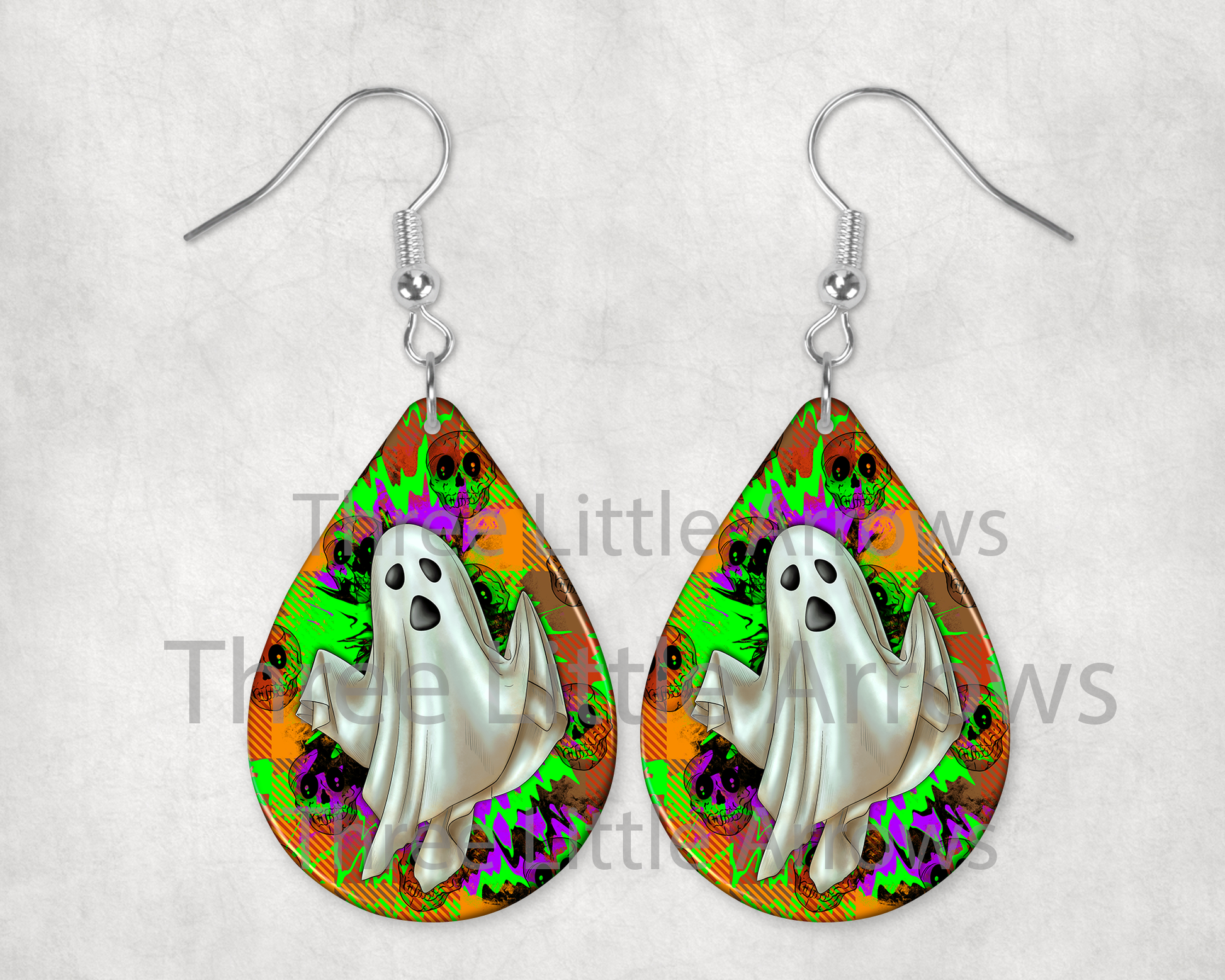 Add a little frightful fun to your look with these bold Ghost Teardrop Earrings! Featuring a playful ghost design set against a neon skull and splatter background, these earrings are the perfect mix of spooky and stylish. Lightweight and eye-catching, they’re a great accessory for Halloween parties, fall outfits, or anyone who loves a little ghostly charm.